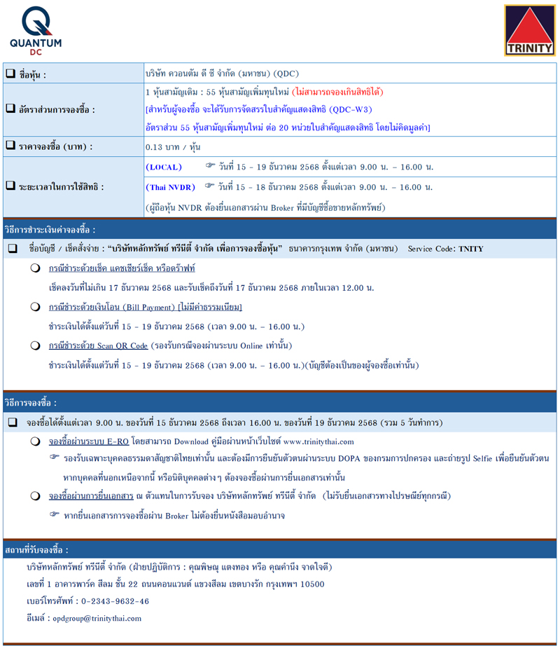 การจองซื้อหุ้นเพิ่มทุน บริษัท ควอนตัม ดี ซี จำกัด (มหาชน) - QDC